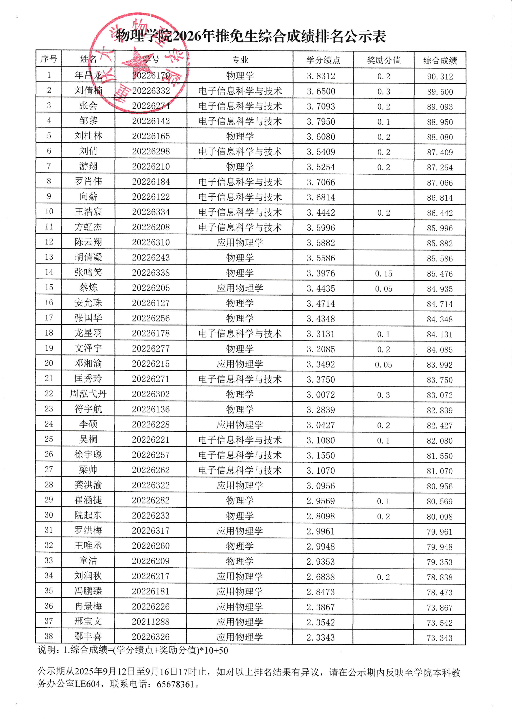 根据学校《关于开展2026年推荐优秀应届本科毕业生免试攻读研究生工作的通知》和《91直播 推荐优秀应届本科毕业生免试攻读研究生遴选工作细则》的相关规定,经过报名、初审、公开答辩程序,现将2026年推免生综合成绩排名予以公示: