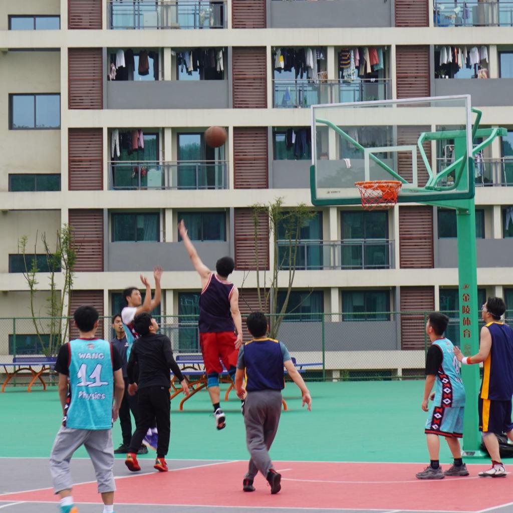 教师篮球队与2019级本科生队在虎溪校区兰园篮球场,进行了一场紧张激烈的篮球比拼。